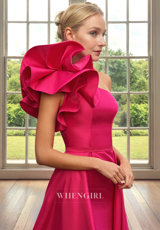 Sheath One Shoulder Sleeveless Ruffles Satin Mother of Bride Dress with Side Slit and Detachable Train