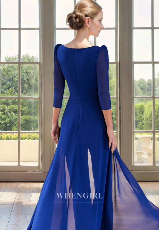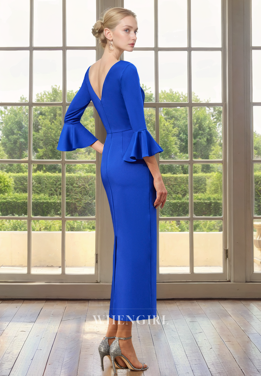 Sheath V Neck 34 Length Sleeves Pleated Back Zipper Mother of Bride Dress with Slit