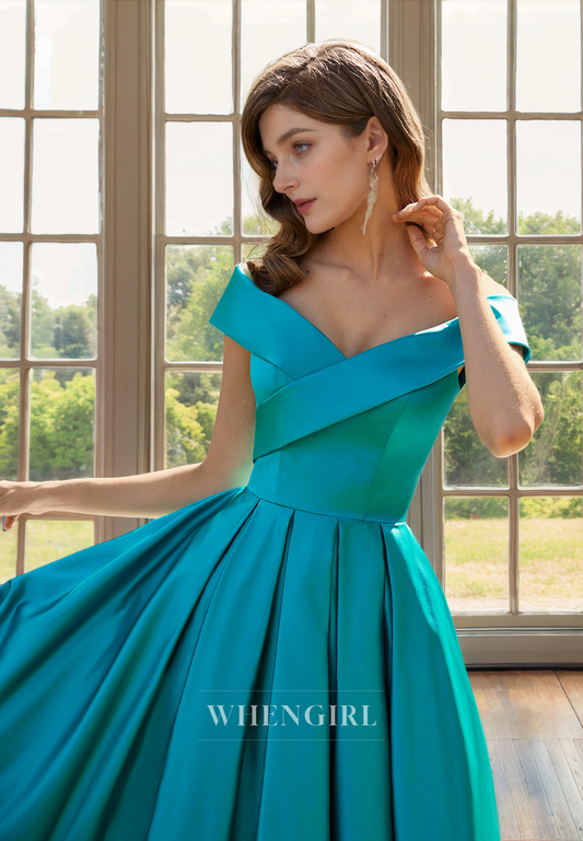 A-Line Off Shoulder Sleeveless Tea Length Satin Mother of Bride Dress