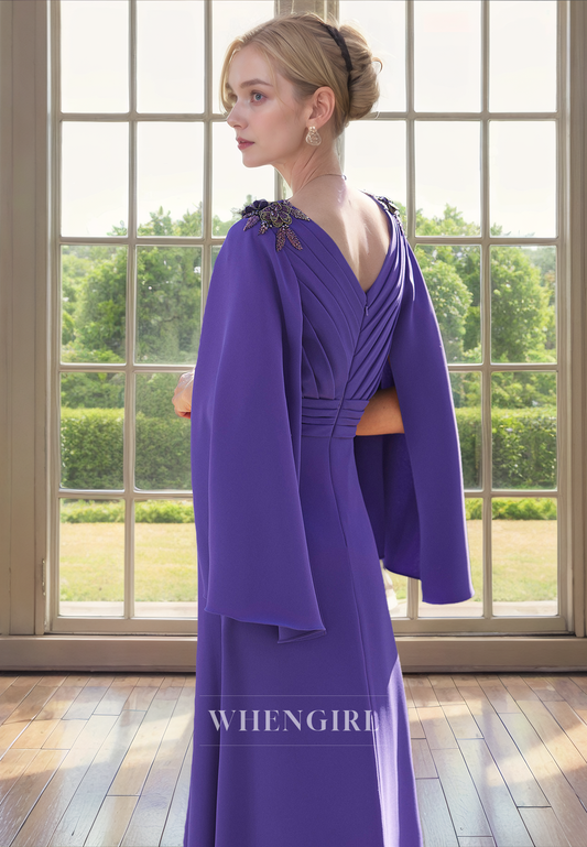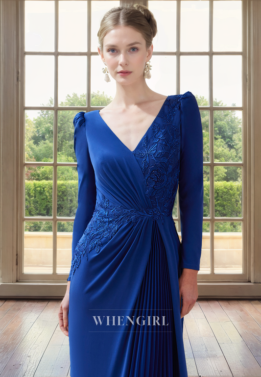 Sheath V Neck Long Sleeves Pleated Lace Appliques Long Mother of Bride Dress