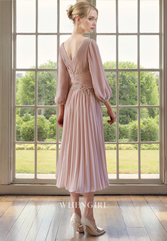 A-Line V Neck 34 Length Sleeves Pleated Appliques Tea Length Mother of Bride Dress