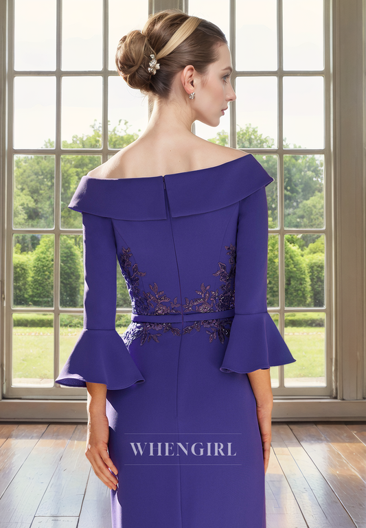 Sheath Off Shoulder 34 Length Sleeves Pleated Ruffles Back Zipper Mother of Bride Dress with Slit