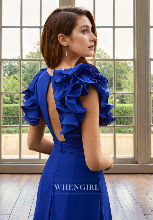 A-Line Off Shoulder Sleeveless Pleated Ruffles Mother of Bride Dress with Slit and Belt