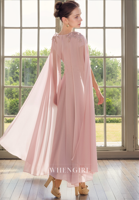 A-Line V Neck Sleeves Beaded Tea Length Mother of Bride Dress