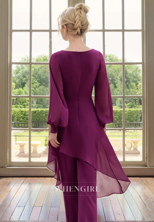 Jumpsuit V Neck Long Sleeves Plated Appliques Chiffon Mother of Bride Dress