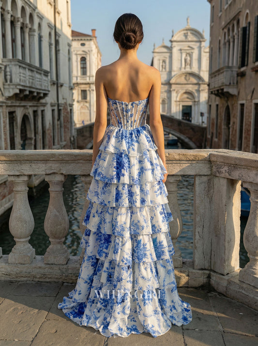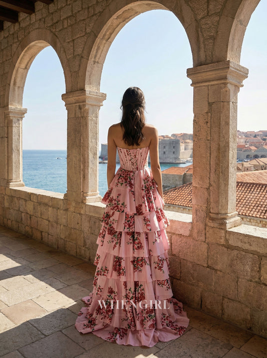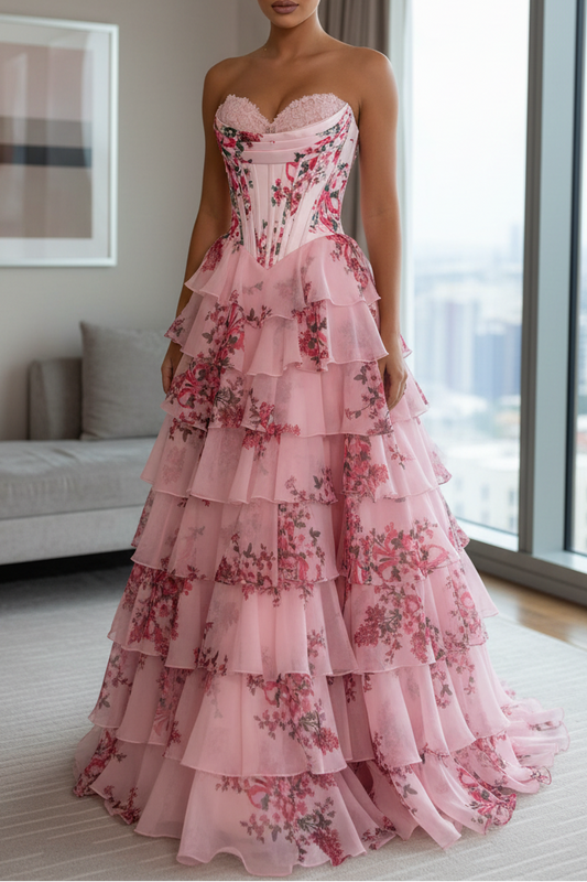 Cute A Line Sweetheart Floral Chiffon Tiered Prom Dress