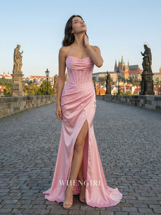Mermaid Pink Strapless Side Slit Ruched Prom Dress