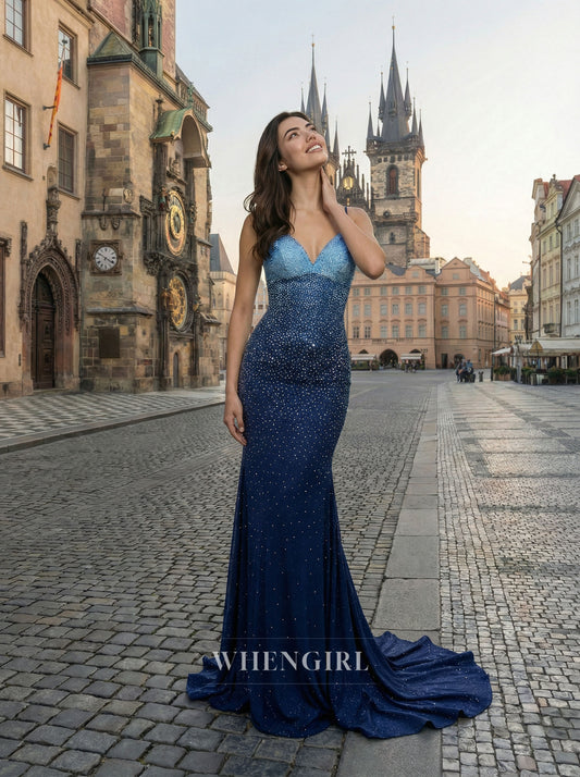 Sky Blue V Neck Spaghetti Strap Beaded Mermaid Prom Dress