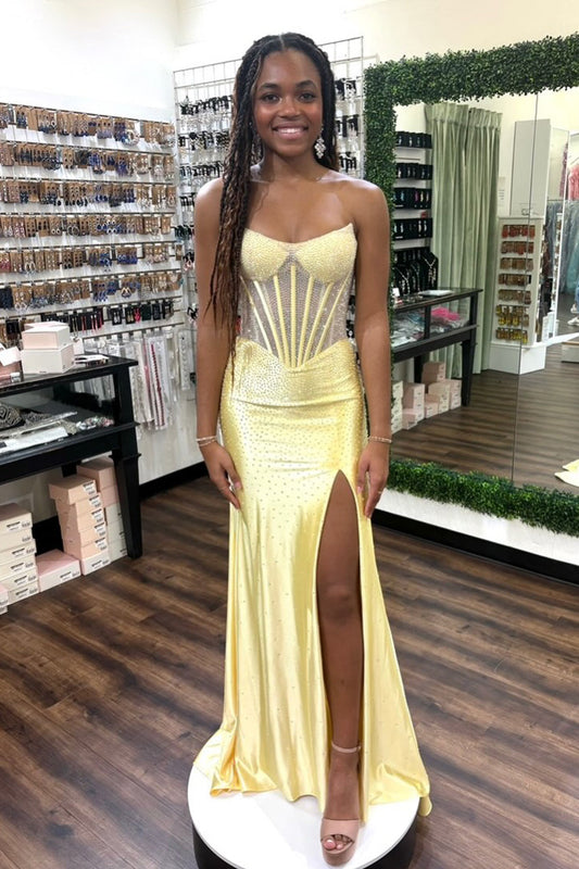 Yellow Strapless Beaded Rhinestones A-Line Prom Dress