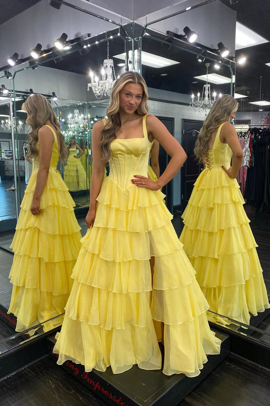 A-Line Multi Tiered Ruffles Spaghetti Straps Side Slit Prom Dress