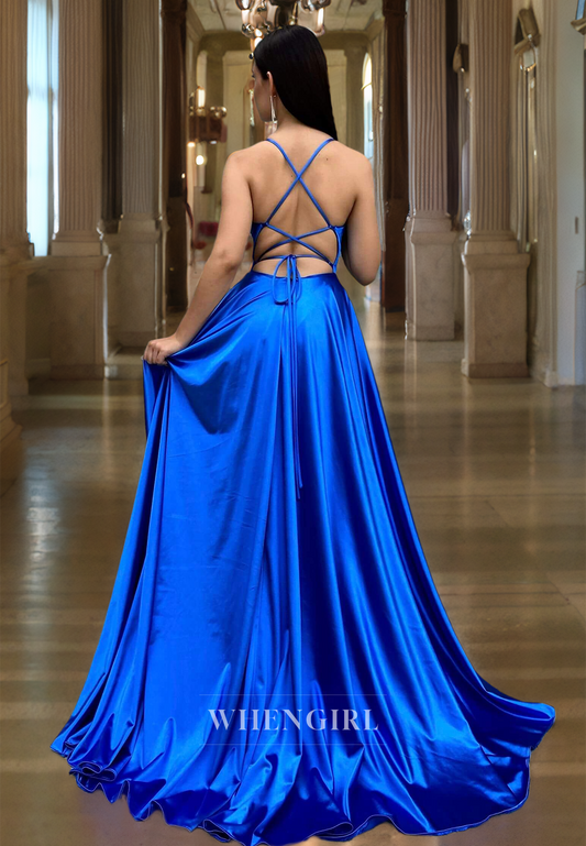 V-Neck Spaghetti Straps Sheath Stripe Sweep Train Pleated Satin Prom Dress with Split Evening Gowns