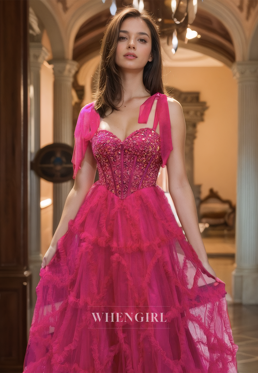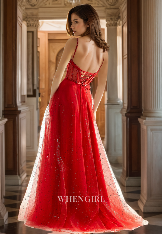 A-Line Spaghetti Straps Sweetheart High Split Sleeveless Glitter Lace Prom Dress with Beads Evening Dress