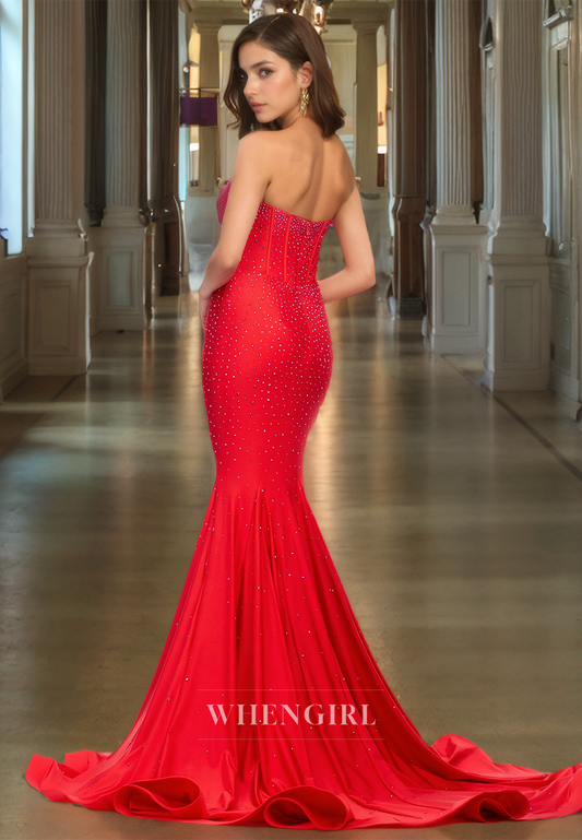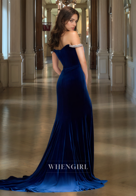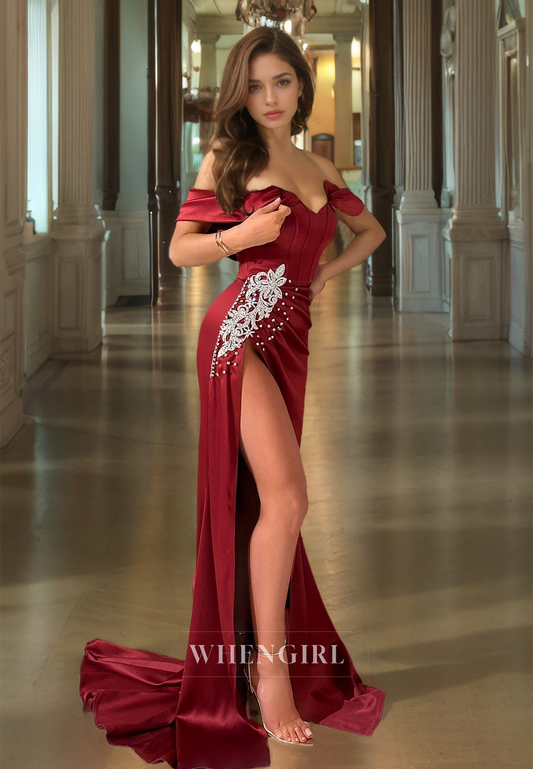 Off-Shoulder Sweetheart Sleeveless Mermaid Slit Pleats Beaded Satin Prom Dress with Train Formal Gown