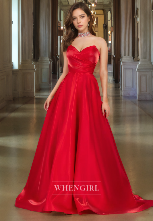Classic & Modern A-Line Sweetheart Sleeveless Sweep Train Satin Prom Dress Party Dress with Pleats