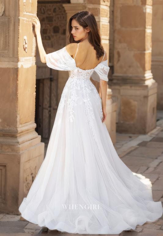 Off-Shoulder Sweetheart A-Line Wedding Dress High Split Train Lace Bridal Dress with Appliques