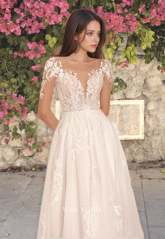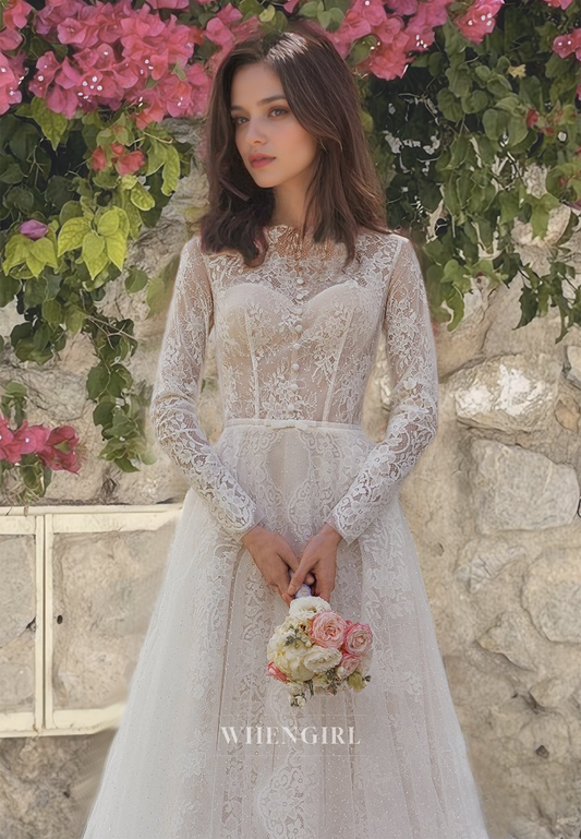 A-Line Sweetheart Long Sleeves Appliques Lace Wedding Dress with Sweep Train Bridal Gowns