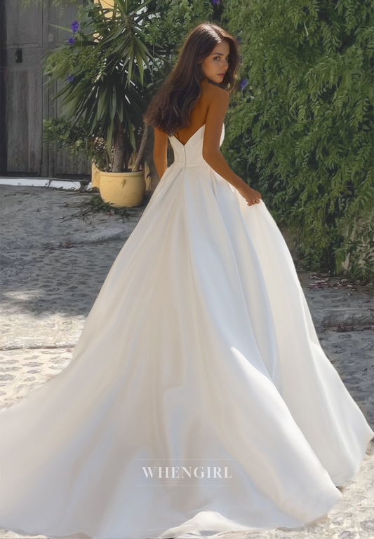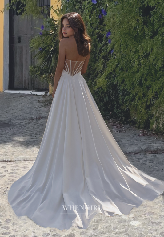 A-Line Sweetheart Sleeveless Wedding Dress High Split Ruched Satin Bridal Dress with Train