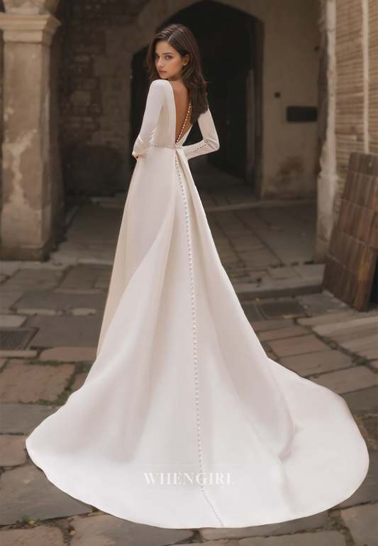 V-Neck A-Line Long Appliques Sleeves Pleated Satin Wedding Dress with Train Bridal Dress