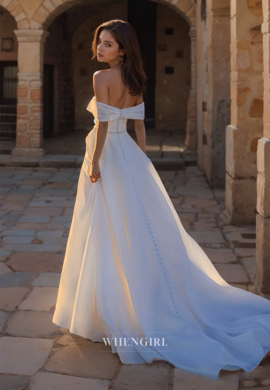 Off-Shoulder A-Line Sleeveless Brush Train Pleated Satin Wedding Dress with High Split Bridal Dress