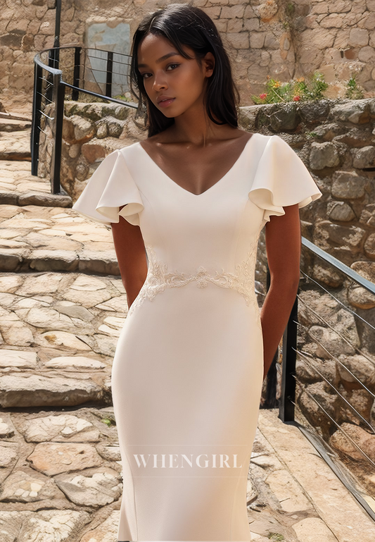Low V-Neck Mermaid Short Sleeves Train Satin Beach Wedding Dress with Appliques Boho Gowns