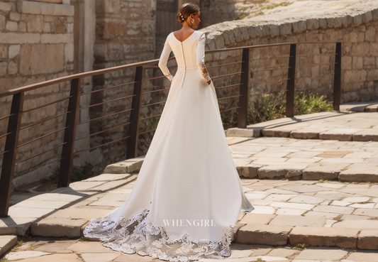 Scoop Neck A-Line Long Sleeves Sweep Train Pleated Satin Wedding Dress with Appliques Bridal Dress