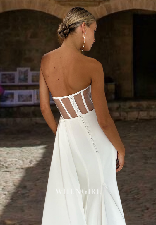 Classic&Simple Strapless A-Line Sleeveless High Split Train Satin Bridal Gowns with Beaded Wedding Dress