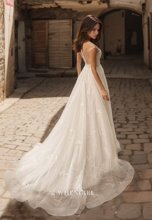 A-Line Scoop Neck Cap Sleeves Appliques Lace Beach Wedding Dress with Court Train Bridal Gowns