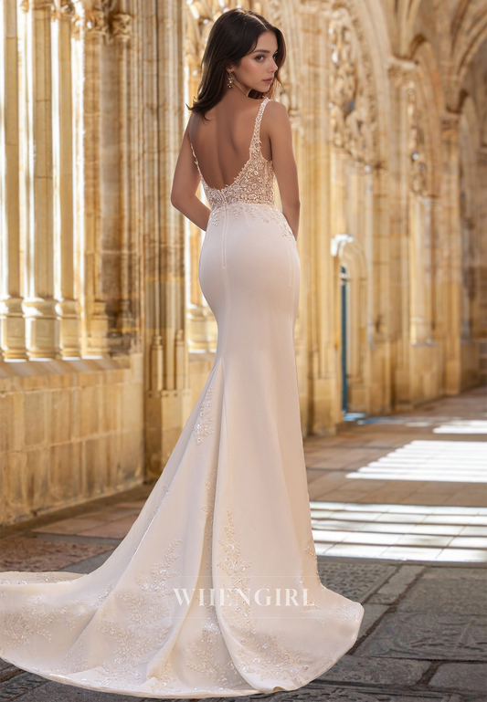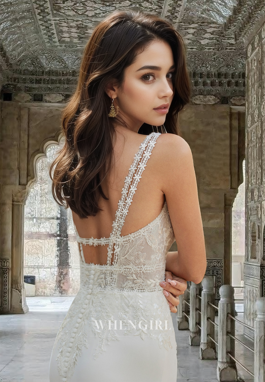 Mermaid V Neck Straps Sleeveless Appliques Lace Wedding Dress with Train