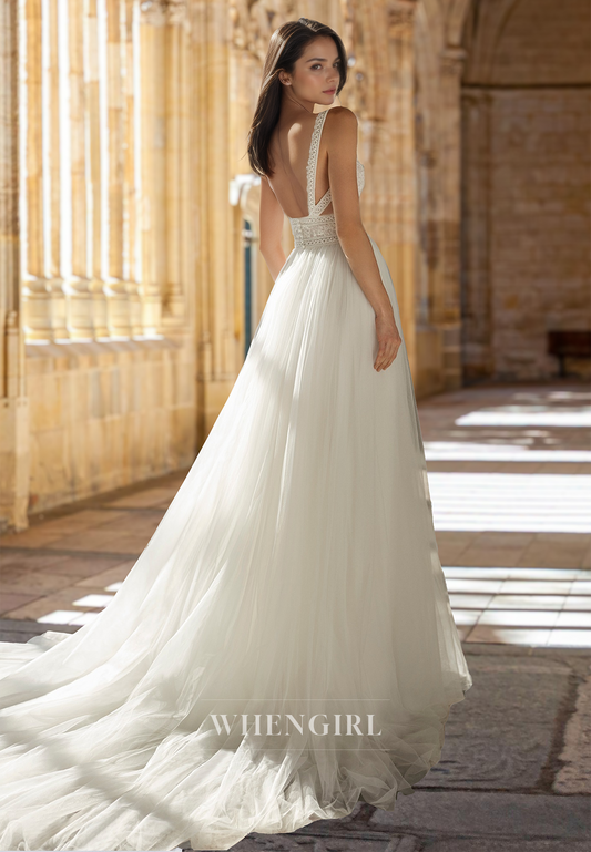 Sexy V-Neck Straps Sheath Sweep Train Sleeveless Two Piece Wedding Dress with Beaded Bridal Gown
