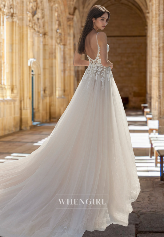 Spaghetti Straps A-Line High Slit Train Lace Pleats Wedding Dress Long Bridal Dress with Appliques