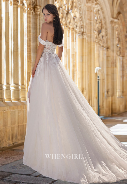 Elegant Off-Shoulder A-Line Side Slit Train Lace Pleats Wedding Dress with Floral Bridal Gown