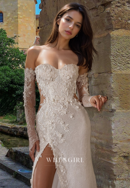 Romantic Sweetheart Sheath Sleeves High Split Appliques Lace Wedding Dress with Floral