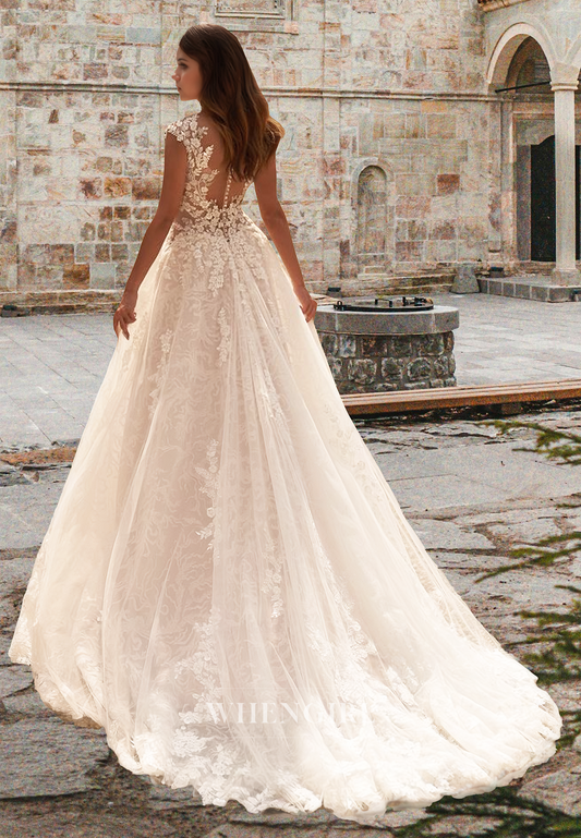 A-Line V-Neck Cap Sleeves Sweep Train Lace Pleats Long Wedding Dress Bridal Gown with Appliques