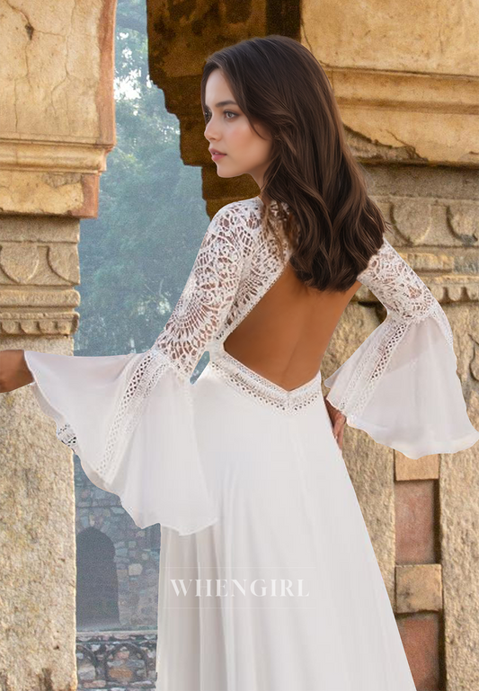 A-Line Scoop Neck Long Sleeves Lace Chiffon Wedding Dress with Train