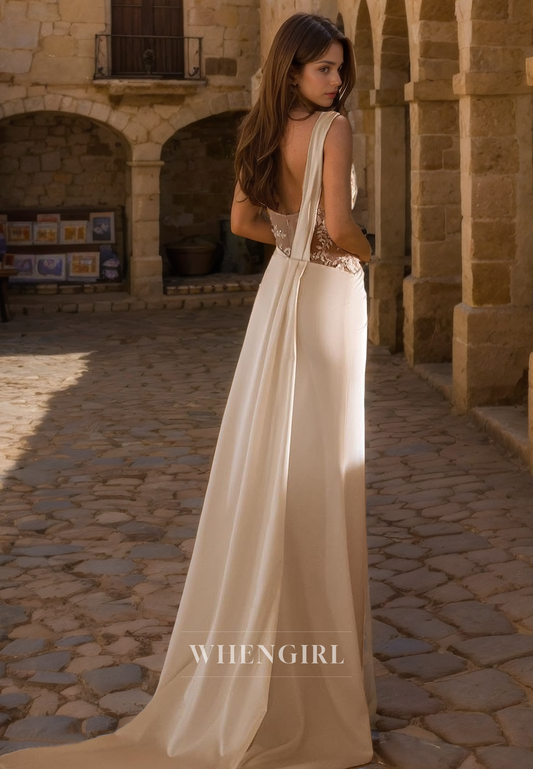 Graceful V-Neck Straps Sheath Train Satin Long Wedding Dress Bridal Gown with Appliques