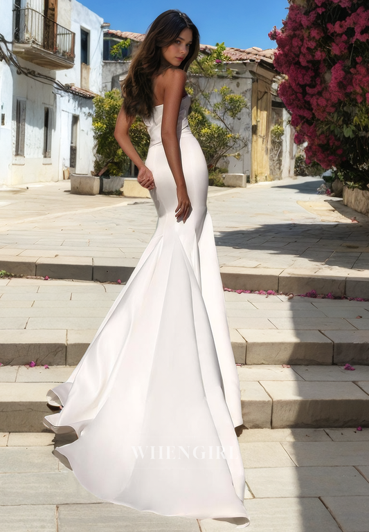 Mermaid Strapless Sleeveless Pleated Beach Wedding Dress with Train