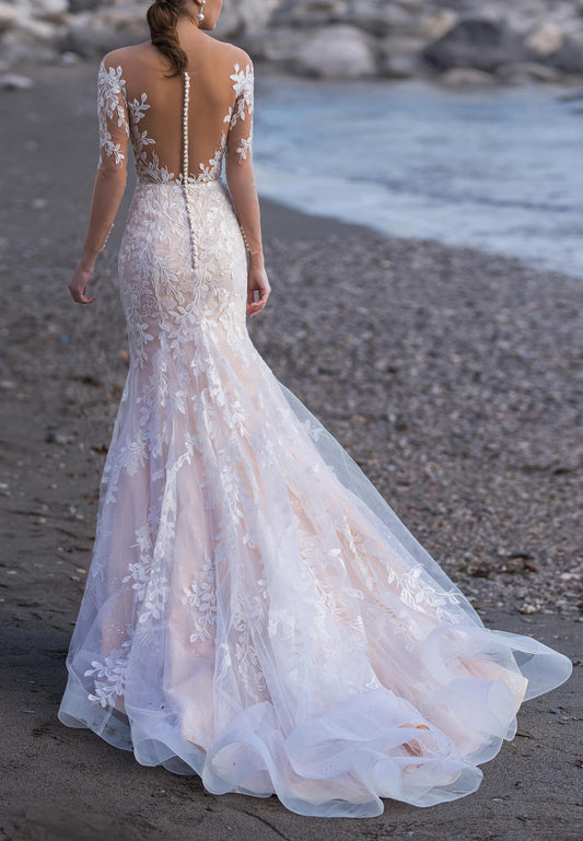 A-Line Scoop Neck Long Lantern Sleeves Tulle Tiered Beaded Wedding Dress