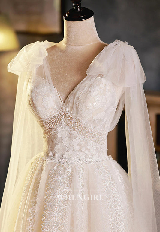 A-Line V Neck Short Sleeves Lace Boho Beach Wedding Dress with Court Train