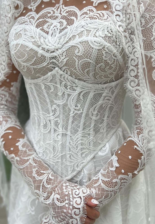 High Neck Long Sleeves Appliqued Lace A-Line Court Train Wedding Dress