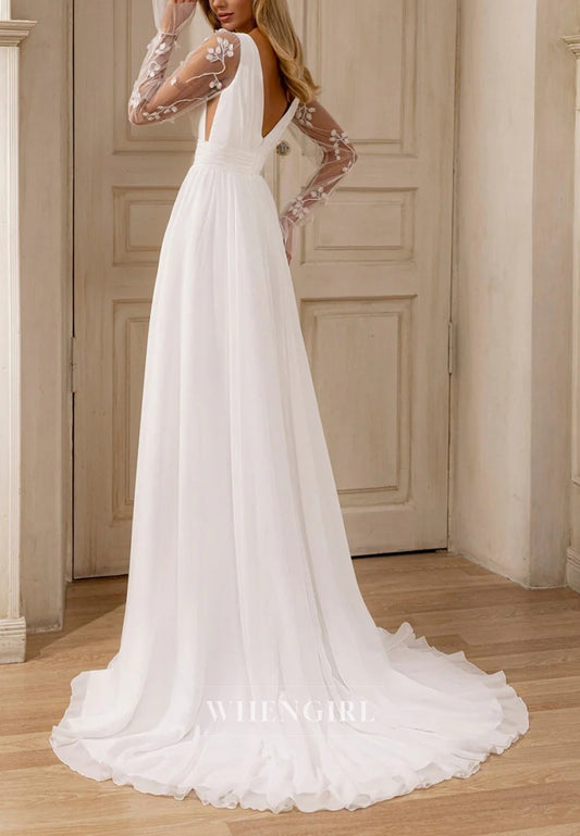 A-Line Sheer Sleeved Deep V Neck Beach Wedding Dress with Floral Accents and Sweep Train