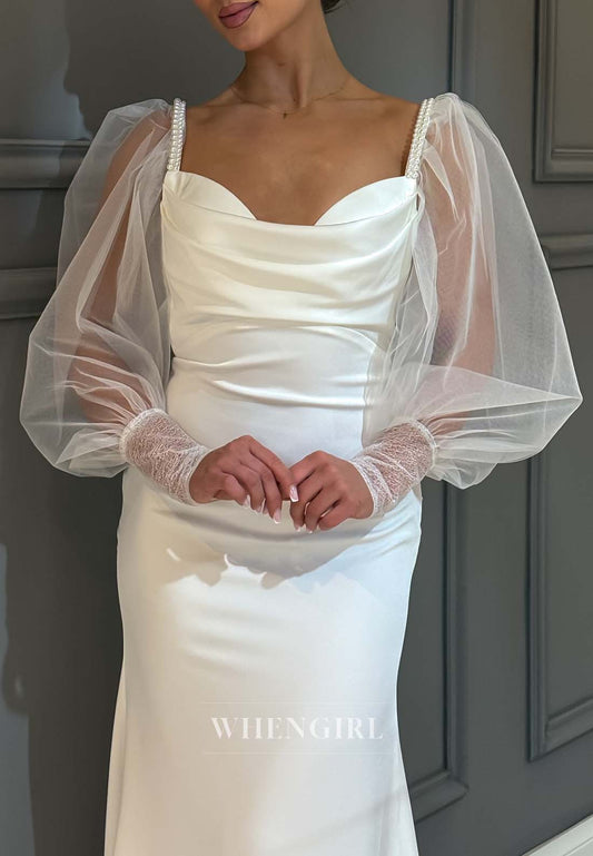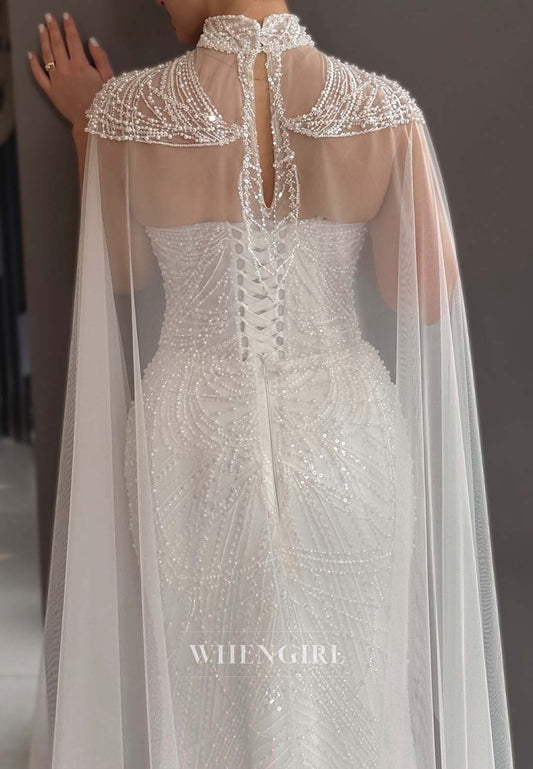 Graceful Off Shoulder Pearls Beading Mermaid Wedding Dress with Long Removable sleeves and Court Train