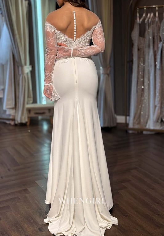 Off Shoulder Appliqued V Neck Slit Bell Sleeves Sheath Floor Length Beach Wedding Dress