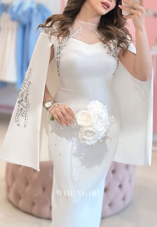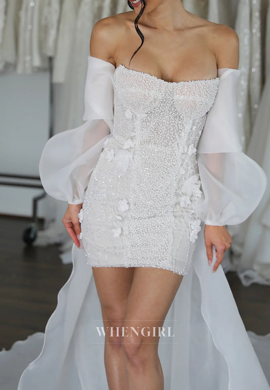 Strapless Pearls Beading Floral Back Zipper Sheath Short Wedding Dress with Removable Sleeves and Train