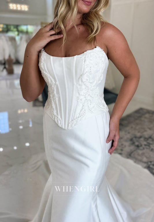 Strapless Mermaid Satin Beaded Corset Court Train Sleeveless Wedding Dress