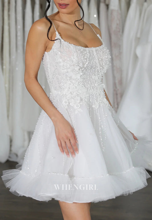 Pearls Beading Frill Hem Scoop Neck Floral A-Line Sleeveless Tulle Short Wedding Dress