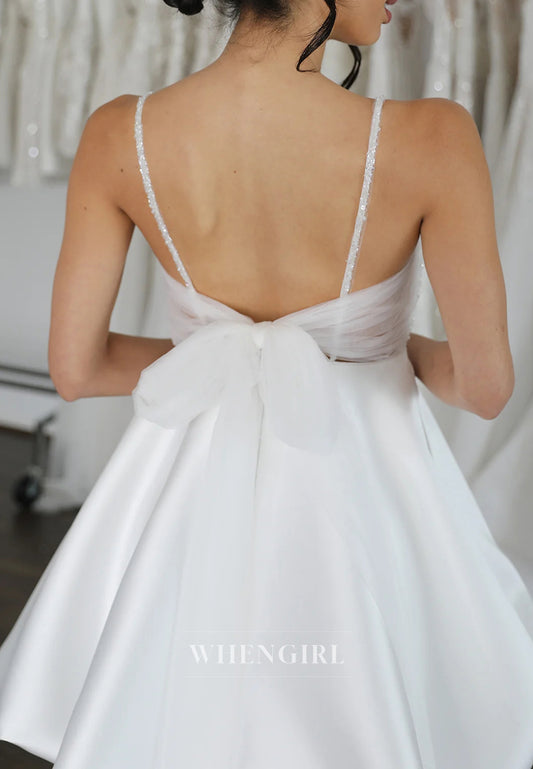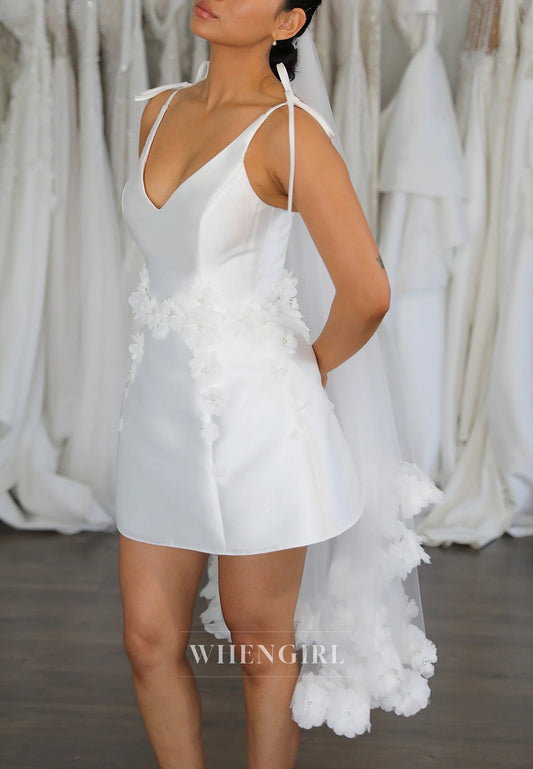 Sheath Satin Bowknot Straps Sleeveless V Neck Floral Short Wedding Dress with Viel