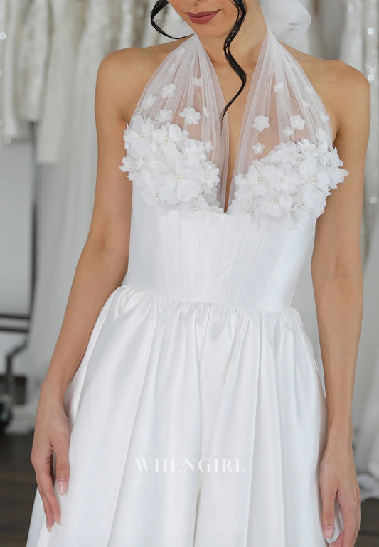 V Neck Halter Floral Sleeveless A-Line Back Zipper Satin Wedding Dress with Court Train