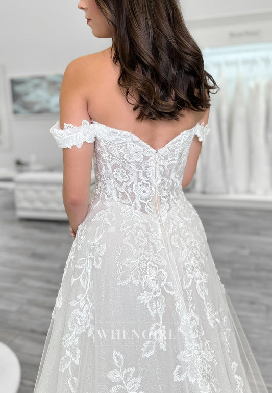 Off Shoulder Appliqued Lace A-Line Chapel Train Back Zipper Wedding Dress