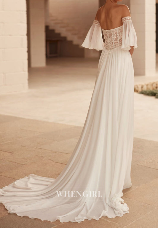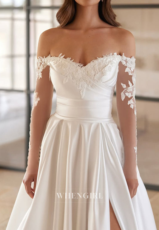 A-line Appliqued Long Sleeves Off Shoulder Side Slit Chiffon Wedding Dress with Court Train