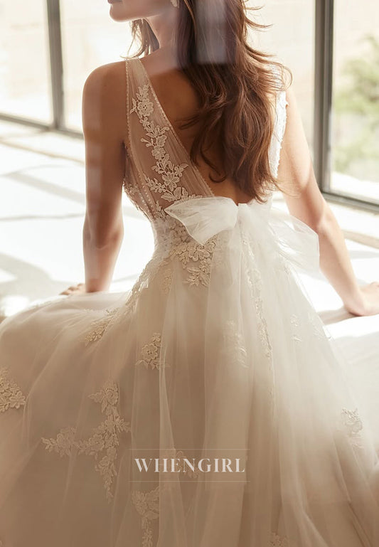 A-line V Neck Tulle Appliqued Beach Wedding Dresses with Train